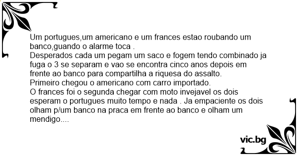 Um portugues,um americano e um frances estao roubando um banco,guando o alarme toca .