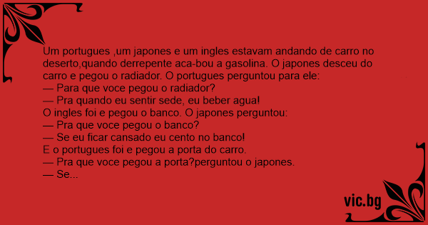 Um portugues ,um japones e um ingles estavam andando de carro no deserto,quando derrepente aca-bou a gasolina. O japones desceu do carro e pegou o radiador. O portugues perguntou para ele: