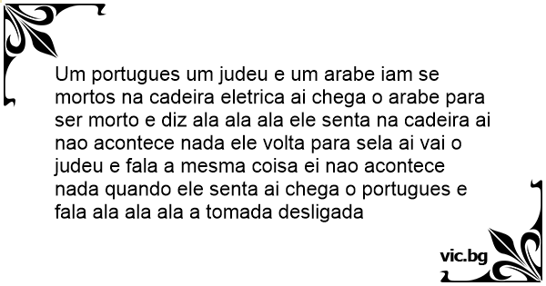 Um portugues um judeu e um arabe iam se mortos na cadeira eletrica ai chega o arabe para ser morto e diz ala ala ala ele senta na cadeira ai nao acontece nada ele volta para sela ai vai o judeu e fala a mesma coisa ei nao acontece nada quando ele senta ai chega o portugues e fala ala ala ala a tomada desligada