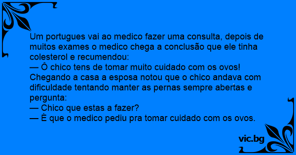 Um portugues vai ao medico fazer uma consulta, depois de muitos exames o medico chega a conclusão que ele tinha colesterol e recumendou:
