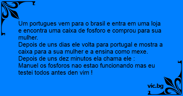 Um portugues vem para o brasil e entra em uma loja e encontra uma caixa de fosforo e comprou para sua mulher.
