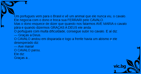 Mas o dono esquece de dizer que quando nos falarmos AVE MARIA o cavalo pára e quando dizermos GRAÇAS A DEUS ele anda.