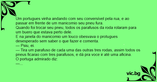 Um portugues vinha andando com seu conversível pela rua, e ao passar em frente de um manicomio seu pneu fura.