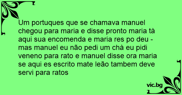 Um portuques que se chamava manuel chegou para maria e disse pronto maria tà aqui sua encomenda e maria res po deu -mas manuel eu não pedi um chà eu pidi veneno para rato e manuel disse ora maria se aqui es escrito mate leão tambem deve servi para ratos