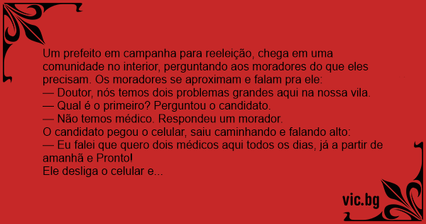 Um prefeito em campanha para reeleição, chega em uma comunidade no interior, perguntando aos moradores do que eles precisam. Os moradores se aproximam e falam pra ele: