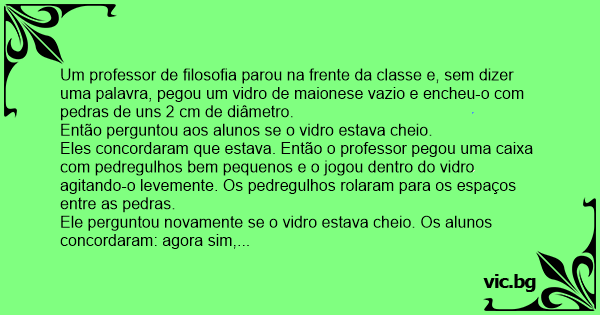 Um professor de filosofia parou na frente da classe e, sem dizer uma palavra, pegou um vidro de maionese vazio e encheu-o com pedras de uns 2 cm de diâmetro.