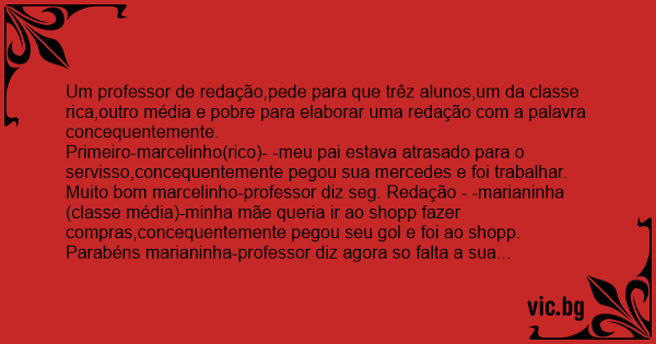 Um professor de redação,pede para que trêz alunos,um da classe rica,outro média e pobre para elaborar uma redação com a palavra concequentemente.