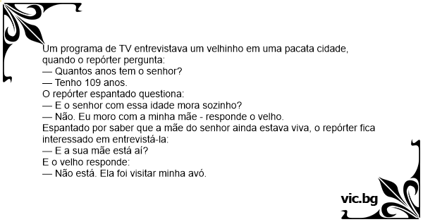 Um programa de TV entrevistava um velhinho em uma pacata cidade, quando o repórter pergunta: