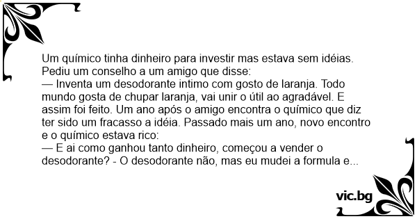 — Inventa um desodorante intimo com gosto de laranja. Todo mundo gosta de сhuраr laranja, vai unir o útil ao agradável. E assim foi feito. Um ano após o amigo encontra o químico que diz ter sido um fracasso a idéia. Passado mais um ano, novo encontro e o químico estava rico: