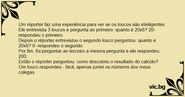 Ele entrevista 3 loucos e pergunta ao primeiro: quanto é 20x5? 20- respondeu o primeiro.