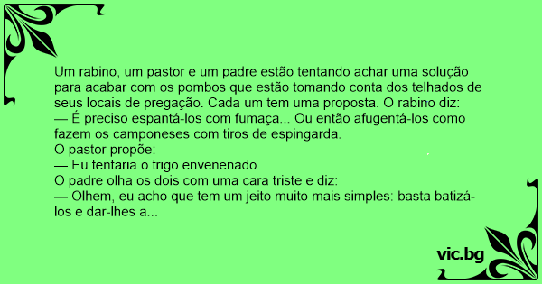 Um rabino, um pastor e um padre estão tentando achar uma solução para acabar com os pombos que estão tomando conta dos telhados de seus locais de pregação. Cada um tem uma proposta. O rabino diz: