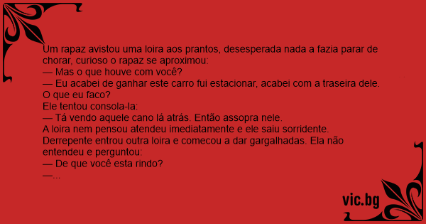 Um rapaz avistou uma loira aos prantos, desesperada nada a fazia parar de chorar, curioso o rapaz se aproximou: