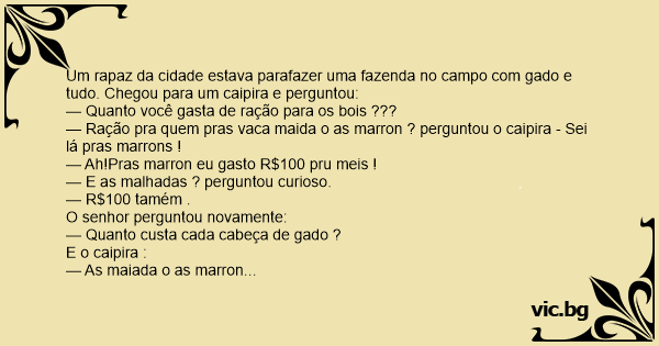 — Ração pra quem pras vаса maida o as marron ? perguntou o caipira - Sei lá pras marrons !