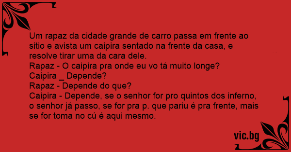 Caipira - Depende, se o senhor for pro quintos dos inferno, o senhor já passo, se for pra p. que pariu é pra frente, mais se for toma no cú é aqui mesmo.