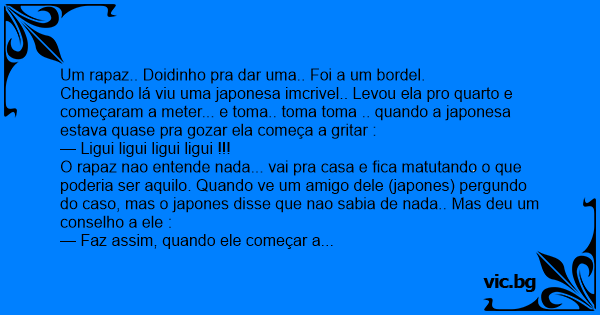 Chegando lá viu uma japonesa imcrivel.. Levou ela pro quarto e começaram a meter... e toma.. toma toma .. quando a japonesa estava quase pra gozar ela começa a gritar :