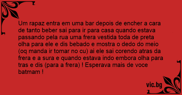 Um rapaz entra em uma bar depois de encher a cara de tanto beber sai para ir para casa quando estava passando pela rua uma frera vestida toda de preta olha para ele e dis bebado e mostra o dedo do meio (oq manda ir tomar no cu) ai ele sai corendo atras da frera e a sura e quando estava indo embora olha para tras e dis (para a frera) ! Esperava mais de voce batmam !