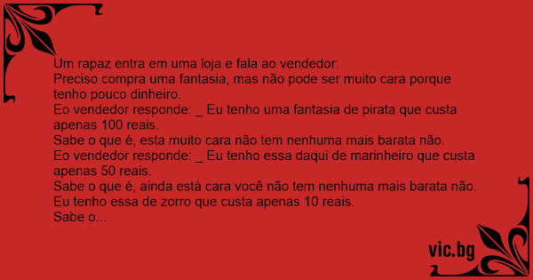 Eo vendedor responde: _ Eu tenho uma fantasia de pirata que custa apenas 100 reais.
