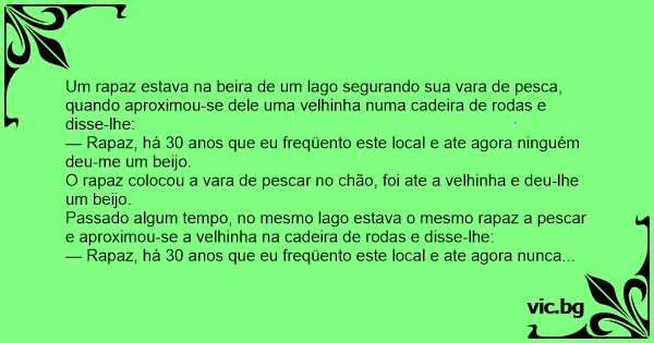 Um rapaz estava na beira de um lago segurando sua vara de pesca, quando aproximou-se dele uma velhinha numa cadeira de rodas e disse-lhe: