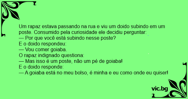 Um rapaz estava passando na rua e viu um doido subindo em um poste. Consumido pela curiosidade ele decidiu perguntar: