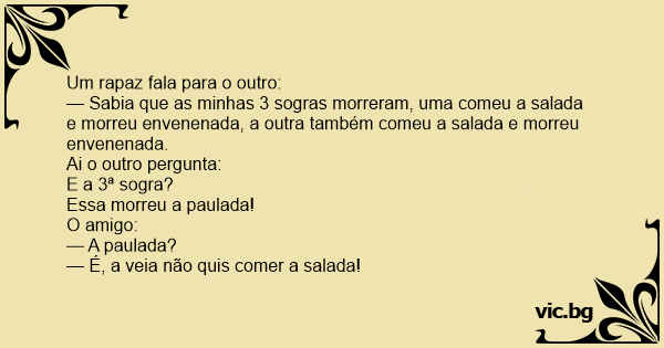 — Sabia que as minhas 3 sogras morreram, uma comeu a salada e morreu envenenada, a outra também comeu a salada e morreu envenenada.