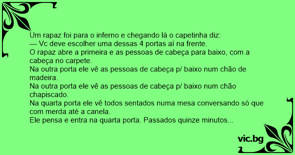 Ele pensa e entra na quarta porta. Passados quinze minutos o capetinha abre a porta e fala: