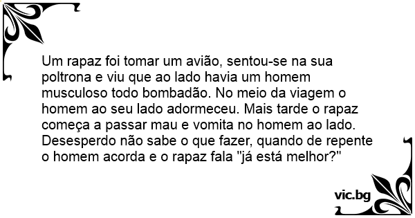 Um rapaz foi tomar um avião, sentou-se na sua poltrona e viu que ao lado havia um homem musculoso todo bombadão. No meio da viagem o homem ao seu lado adormeceu. Mais tarde o rapaz começa a passar mau e vomita no homem ao lado. Desesperdo não sabe o que fazer, quando de repente o homem acorda e o rapaz fala "já está melhor?"