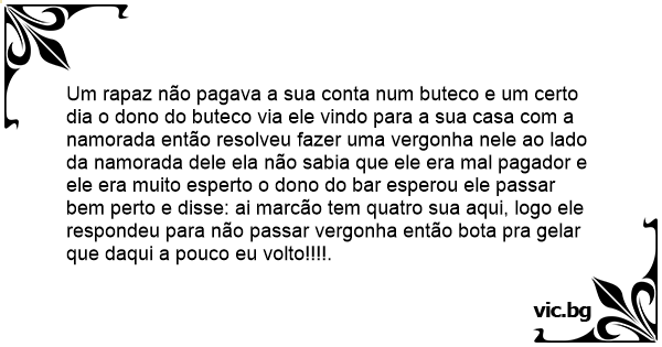 Um rapaz não pagava a sua conta num buteco e um certo dia o dono do buteco via ele vindo para a sua casa com a namorada então resolveu fazer uma vergonha nele ao lado da namorada dele ela não sabia que ele era mal pagador e ele era muito esperto o dono do bar esperou ele passar bem perto e disse: ai marcão tem quatro sua aqui, logo ele respondeu para não passar vergonha então bota pra gelar que daqui a pouco eu volto!!!!.