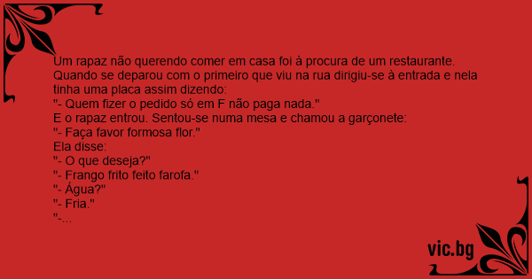 Um rapaz não querendo comer em casa foi à procura de um restaurante. Quando se deparou com o primeiro que viu na rua dirigiu-se à entrada e nela tinha uma placa assim dizendo:
