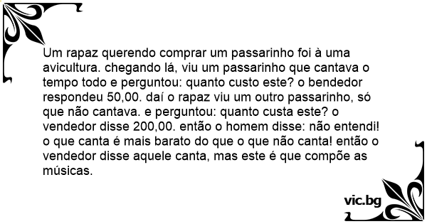 Um rapaz querendo comprar um passarinho foi à uma avicultura. chegando lá, viu um passarinho que cantava o tempo todo e perguntou: quanto custo este? o bendedor respondeu 50,00. daí o rapaz viu um outro passarinho, só que não cantava. e perguntou: quanto custa este? o vendedor disse 200,00. então o homem disse: não entendi! o que canta é mais barato do que o que não canta! então o vendedor disse aquele canta, mas este é que compõe as músicas.