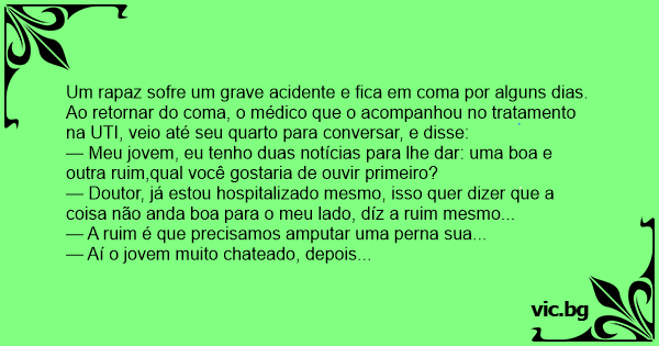 — Meu jovem, eu tenho duas notícias para lhe dar: uma boa e outra ruim,qual você gostaria de ouvir primeiro?