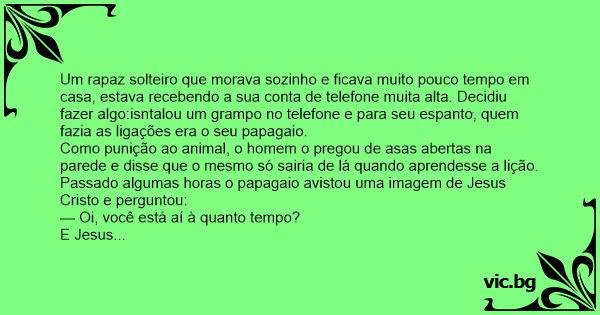 Um rapaz solteiro que morava sozinho e ficava muito pouco tempo em casa, estava recebendo a sua conta de telefone muita alta. Decidiu fazer algo:isntalou um grampo no telefone e para seu espanto, quem fazia as ligações era o seu papagaio.