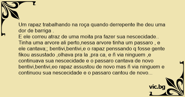 Tinha uma arvore ali perto,nessa arvore tinha um passaro , e ele cantava;; bentivi,bentivi,e o rapaz penssando q fosse gente fikou assustado ,olhava pra la ,pra ca, e ñ via ninguem ,e continuava sua nescecidade e o passaro cantava de novo bentivi,bentivi,eo rapaz assustou de novo mas ñ via ninguem e continuou sua nescecidade e o passaro cantou de novo bentivi,bentivi o rapaz ja nervozo grita: