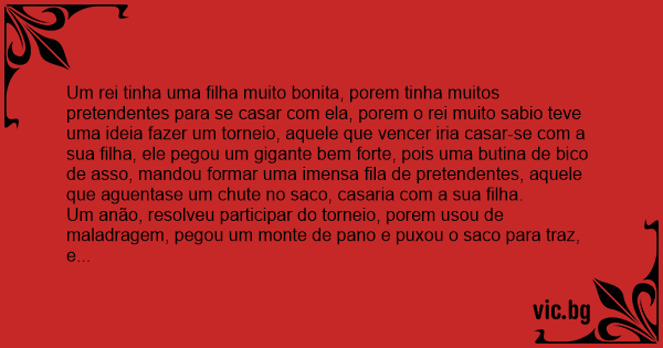 Um rei tinha uma filha muito bonita, porem tinha muitos pretendentes para se casar com ela, porem o rei muito sabio teve uma ideia fazer um torneio, aquele que vencer iria casar-se com a sua filha, ele pegou um gigante bem forte, pois uma butina de bico de asso, mandou formar uma imensa fila de pretendentes, aquele que aguentase um chute no saco, casaria com a sua filha.