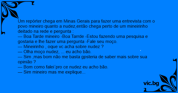 Um repórter chega em Minas Gerais para fazer uma entrevista com o povo mineiro quanto a nudez,então chega perto de um mineirinho deitado na rede e pergunta :