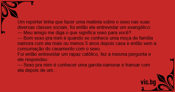 Um repórter tinha que fazer uma matéria sobre o sеxо nas suas diversas classes sociais, foi então ele entrevistar um evangélico: