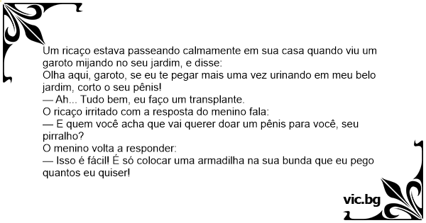 Um ricaço estava passeando calmamente em sua casa quando viu um garoto mijando no seu jardim, e disse: