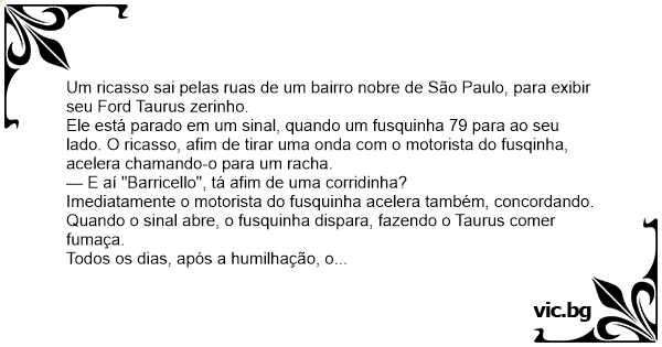 Ele está parado em um sinal, quando um fusquinha 79 para ao seu lado. O ricasso, afim de tirar uma onda com o motorista do fusqinha, acelera chamando-o para um racha.
