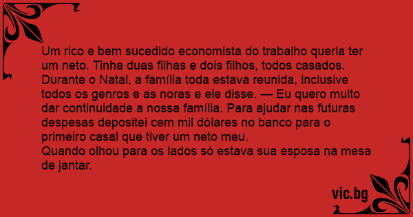 Um rico e bem sucedido economista do trabalho queria ter um neto. Tinha duas filhas e dois filhos, todos casados. Durante o Natal, a família toda estava reunida, inclusive todos os genros e as noras e ele disse. — Eu quero muito dar continuidade a nossa família. Para ajudar nas futuras despesas depositei cem mil dólares no banco para o primeiro casal que tiver um neto meu.