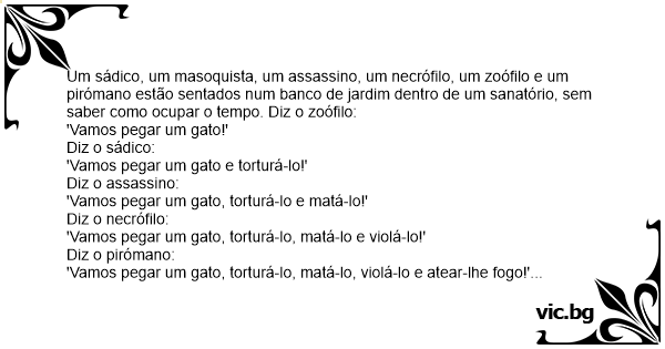 Um sádico, um masoquista, um assassino, um necrófilo, um zoófilo e um pirómano estão sentados num banco de jardim dentro de um sanatório, sem saber como ocupar o tempo. Diz o zoófilo: