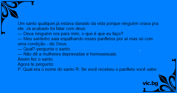 P: Qual era o nome do santo R: Se você recebeu o panfleto você sabe.