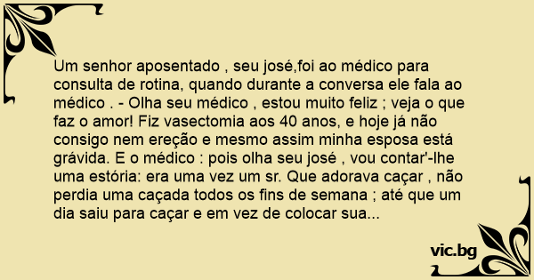 Um senhor aposentado , seu josé,foi ao médico para consulta de rotina, quando durante a conversa ele fala ao médico . - Olha seu médico , estou muito feliz ; veja o que faz o amor! Fiz vasectomia aos 40 anos, e hoje já não consigo nem ereção e mesmo assim minha esposa está grávida. E o médico : pois olha seu josé , vou contar'-lhe uma estória: era uma vez um sr. Que adorava caçar , não perdia uma caçada todos os fins de semana ; até que um dia saiu para caçar e em vez de colocar sua espingarda na mochila , colocou por engano seu guarda-chuvas. Ele estava caçando quando de repente apareceu um enorme urso a sua frente; imediatamente ele puxou o guarda-chuvas , apontou para o urso e abriu ,e o urso caiu durо no chão . E o aposentado falou: