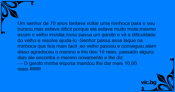 Um senhor de 70 anos tentava voltar uma minhoca para o seu buraco,mas estava dificil porque ela estava muito mole,mesmo assim o velho insistia,nisso passa um garoto e vê a dificuldade do velho e resolve ajuda-lo -Senhor passa esse laque na minhoca que fiса mais facil ,eo velho passou e conseguiu,alem disso agradeceu o menino e lhe deu 10 reais ,passado alguns dias ele encontra o menino novamente e lhe diz .