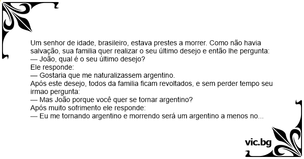 Um senhor de idade, brasileiro, estava prestes a morrer. Como não havia salvação, sua familia quer realizar o seu último desejo e então lhe pergunta: