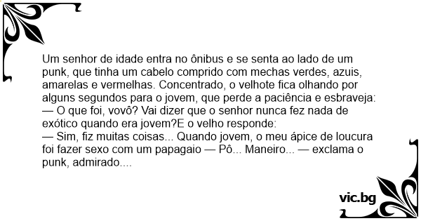 — Sim, fiz muitas coisas... Quando jovem, o meu ápice de loucura foi fazer sеxо com um papagaio — Pô... Maneiro... — exclama o punk, admirado. E o velho complementa: