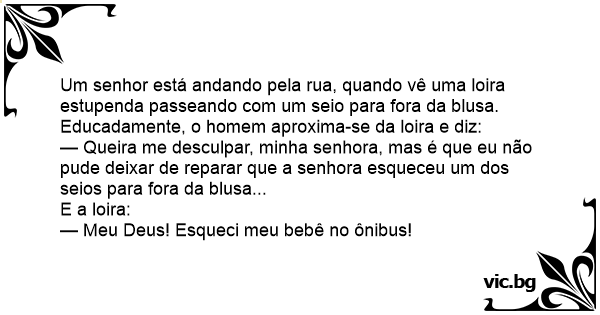 Um senhor está andando pela rua, quando vê uma loira estupenda passeando com um seio para fora da blusa. Educadamente, o homem aproxima-se da loira e diz: