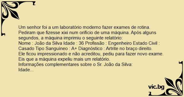 Ele continuava a não acreditar. Foi em casa, fez xixi num vasilha e pediu que a mulher a filha também fizessem, colocou ali também um pouco de seu esperma, tirou óleo do carro, juntou tudo e levou ao dito laboratório. Colocaram a tal mistura na máquina e prontamente saiu outro relatório: