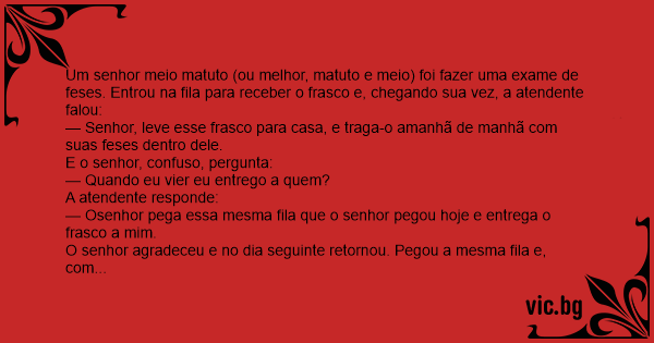 O senhor agradeceu e no dia seguinte retornou. Pegou a mesma fila e, com o frasco deixando transparecer suas feses, esperava calmamente sua vez. Todos estavam olhando e rindo.