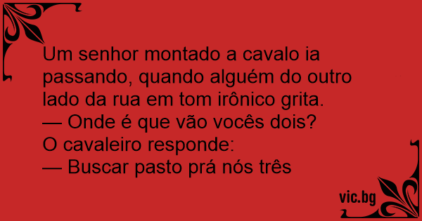 Um senhor montado a cavalo ia passando, quando alguém do outro lado da rua em tom irônico grita.