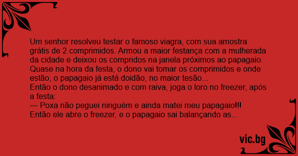 Um senhor resolveu testar o famoso viаgrа, com sua amostra grátis de 2 comprimidos. Armou a maior festança com a mulherada da cidade e deixou os compridos na janela próximos ao papagaio.