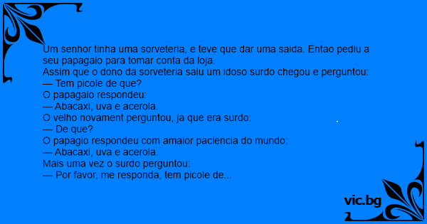 Um senhor tinha uma sorveteria, e teve que dar uma saida. Entao pediu a seu papagaio para tomar conta da loja.